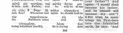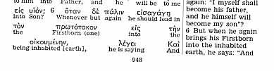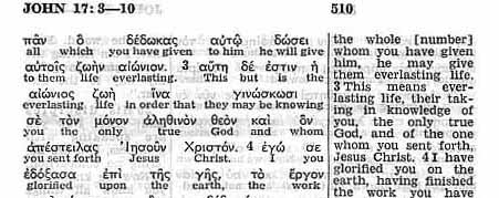 The NWT column reads (The same in both purple and blue editions.) Read carefully the words under the Greek text... "This but is the everlasting life in order that they may be knowing you the only true God and whom you sent forth Jesus Christ." Did you spot the critical difference? The NWT says "taking in knowledge of you" BUT the Greek text in the KIT says something quite different..."they may be knowing you." We need to know God through Jesus Christ in order to have everlasting life. All the knowledge in the world will not save us. Yet the Watchtower Society, by altering the scripture here accomplishes two things in its own self-interest. First, since they dispense "knowledge" through the printed page, it follows that they want their people to be forever "taking in knowledge". Thus the distortion to fit their preconceived ideas. Secondly, they do not want their followers seeking after a relationship with Christ, but dependent instead on their organization. They have therefore dispensed with Christ being the mediator for their followers with the earthly hope, and have substituted their organization in direct violation of 1 Timothy 2:5. We hardly think this course of action would please the "Divine Judge" they claim to be pleasing with their "translation" of His Holy Word!