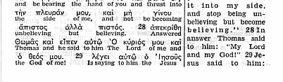 HO THEOS: THE GOD The JW argument is that the Greek term "Ho Theos" (The God) always refers to Jehovah God, whereas "Theos" without the definite article "Ho" could be just Jesus. Yet, In John 20:28, we have the disciple Thomas exclaiming to the risen Christ.... "In answer Thomas said to him: "My Lord and my God!" The KIT correctly shows under the Greek: "Answered Thomas and he said to him The Lord of me and the God of me!"